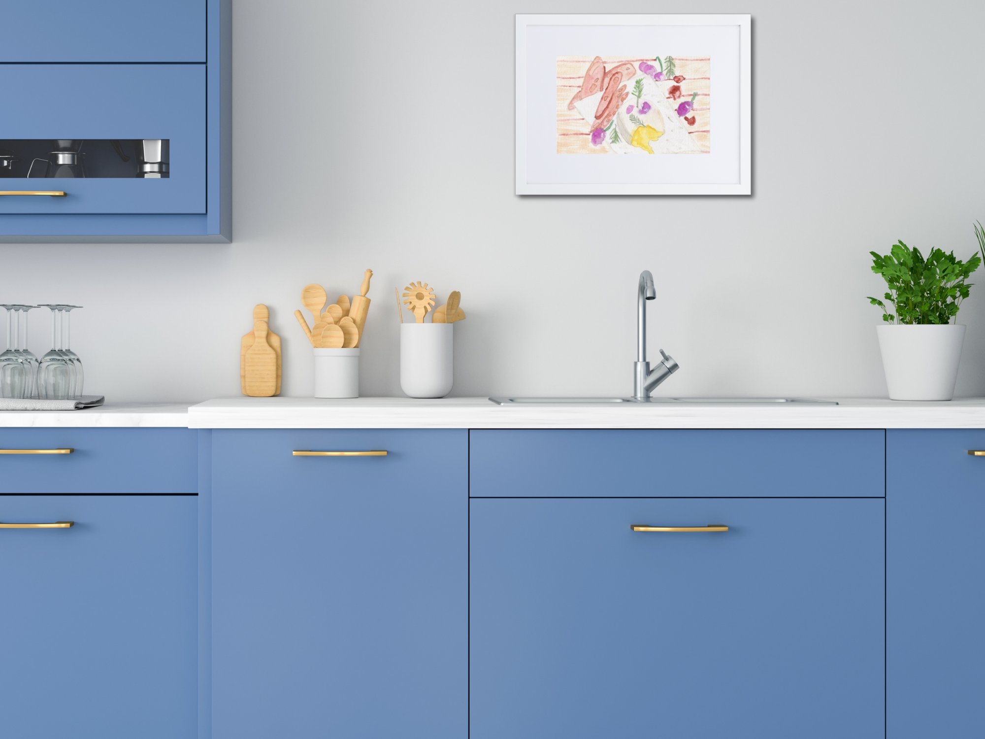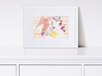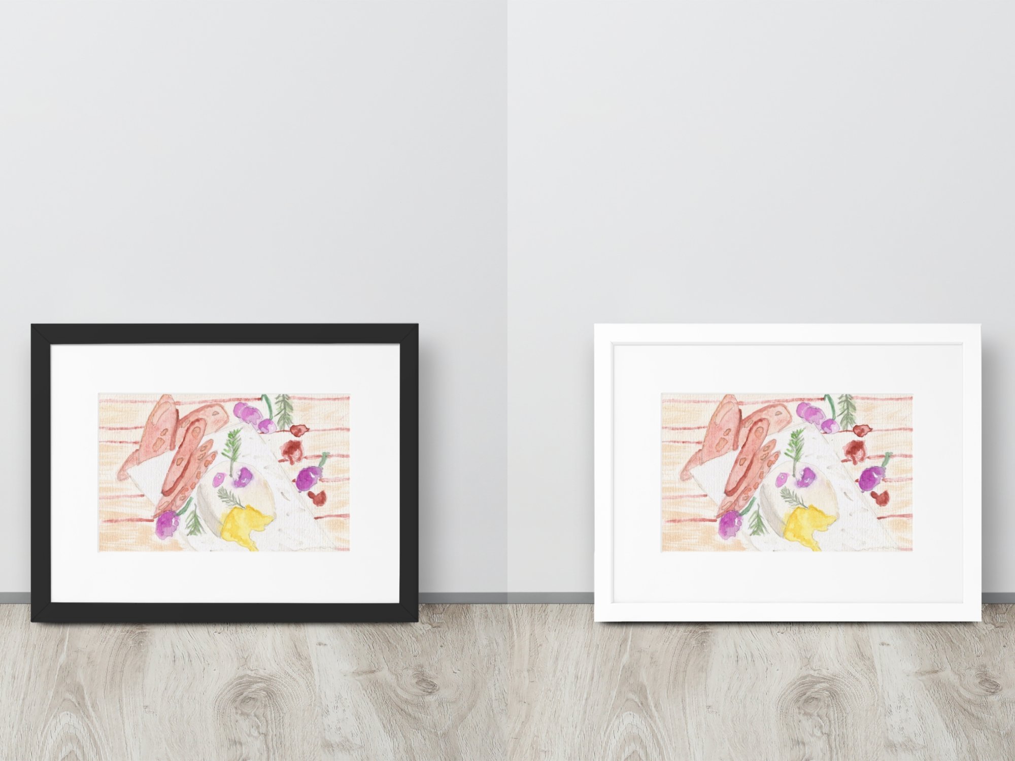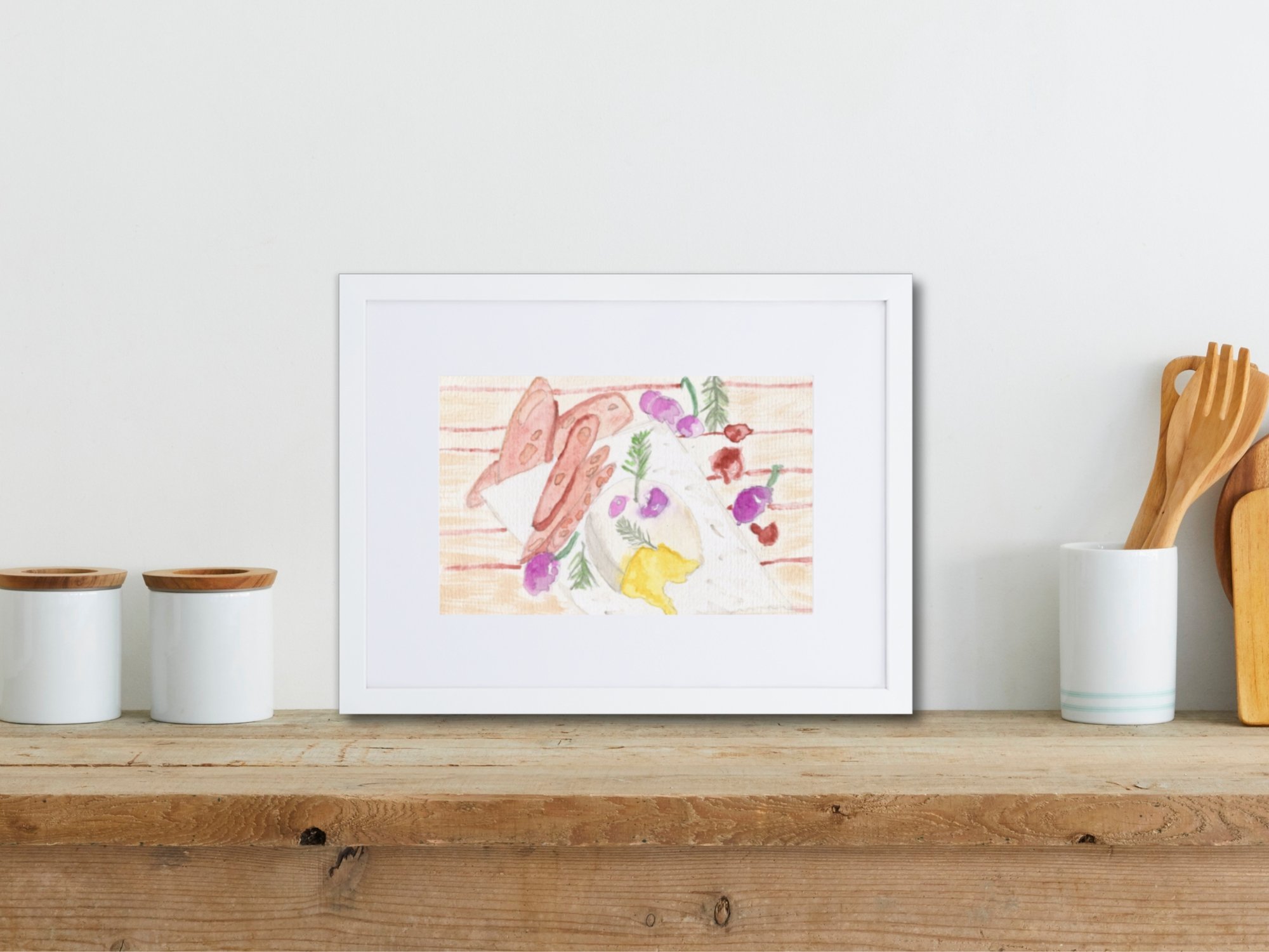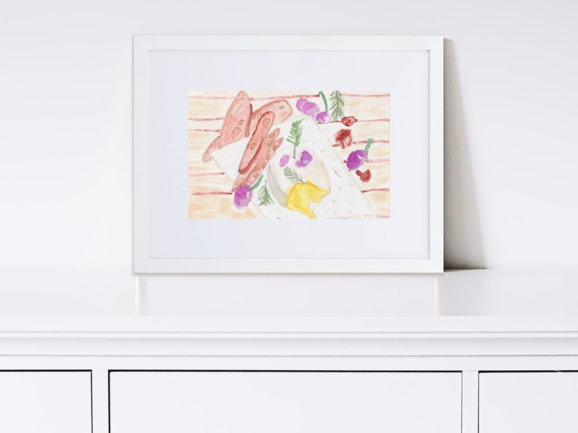 Indulge your senses with this mouthwatering watercolor print featuring a beautifully arranged platter of fresh bread, artisanal cheese, and plump olives. The soft, flowing brushstrokes capture the rustic charm and tempting textures of a classic charcuterie board – ideal for adding warmth and appetite appeal to your kitchen or dining space!