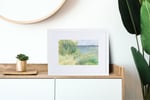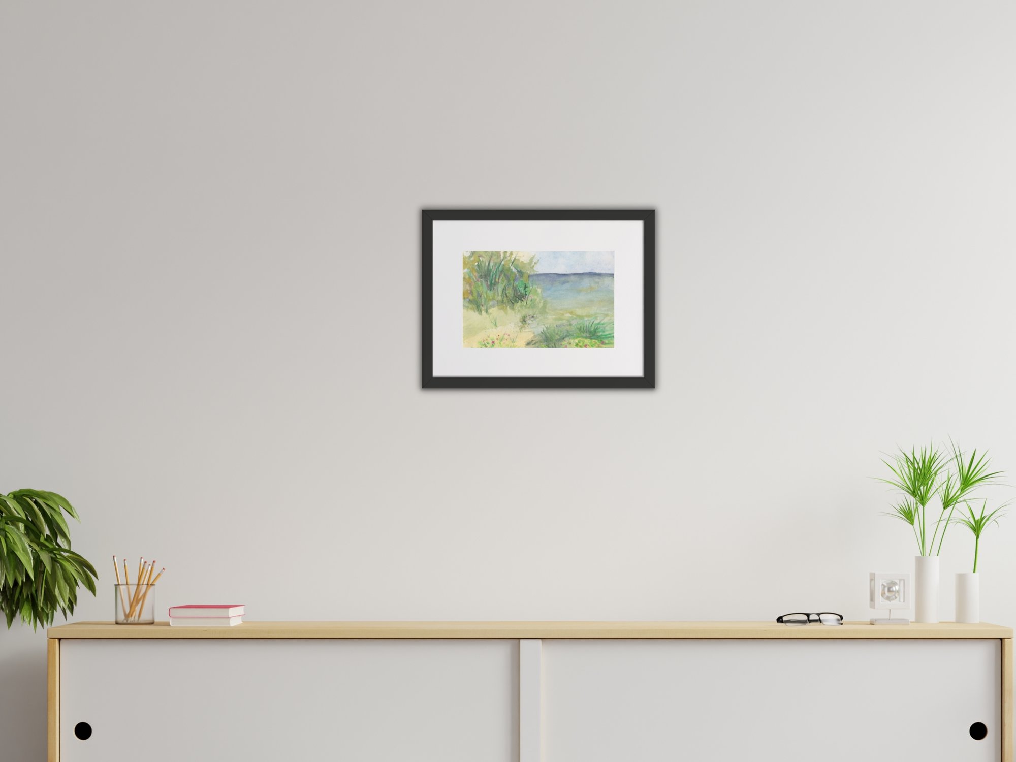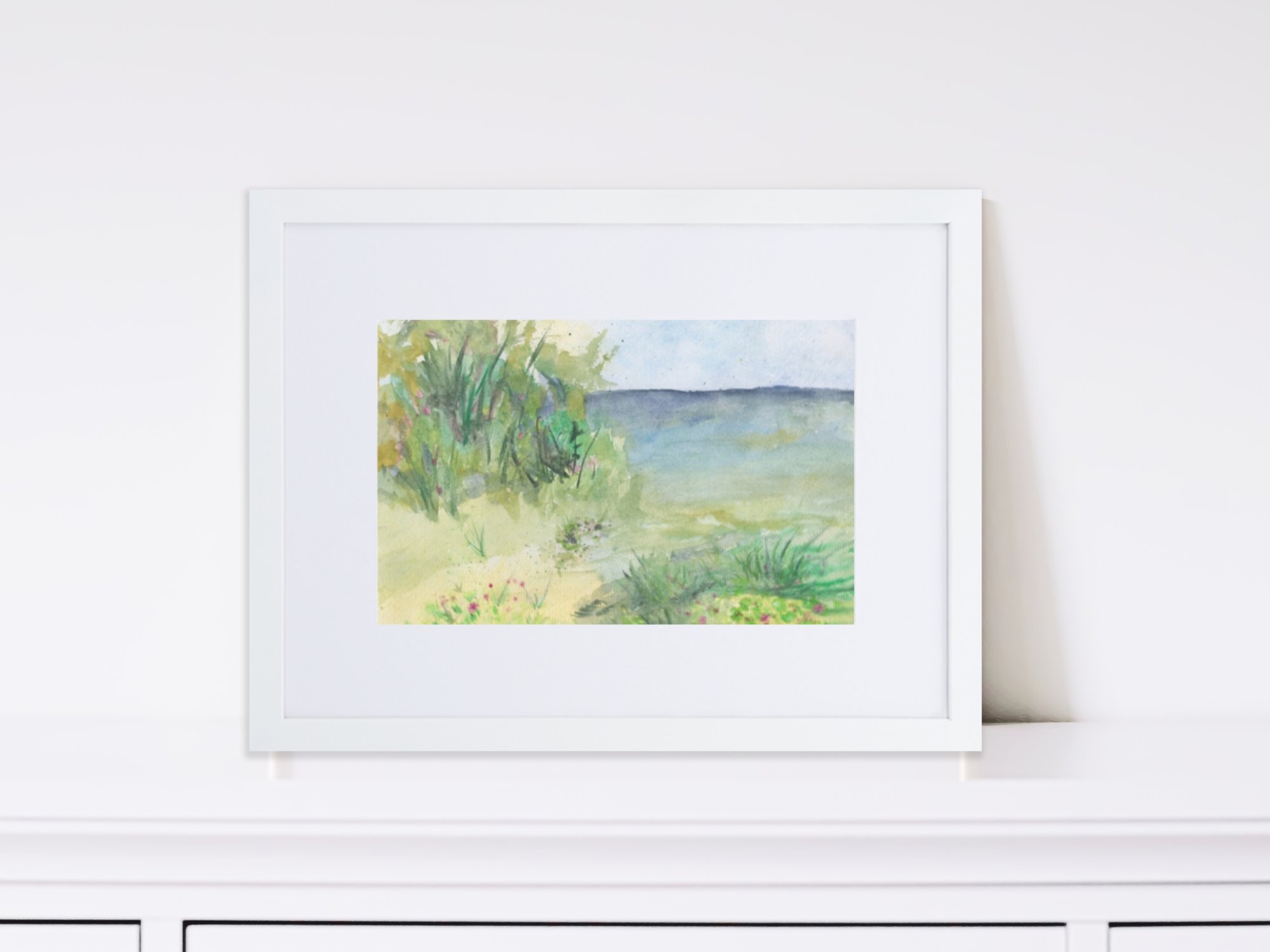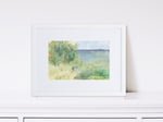 Escape to the shore with this beautiful watercolor print capturing a tranquil seaside landscape – gentle waves lapping at the beach, distant horizons, and soft skies blending in harmonious blues and earthy tones. The fluid brushstrokes create a peaceful, dreamy atmosphere that's perfect for bringing coastal calm into your home.